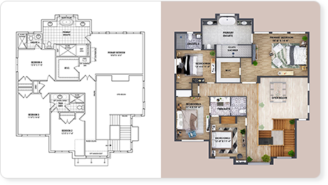2D floor plans are now essential features in the real estate market. Present customers with a professional floorplan, showcasing house layout with textured floor and furniture.