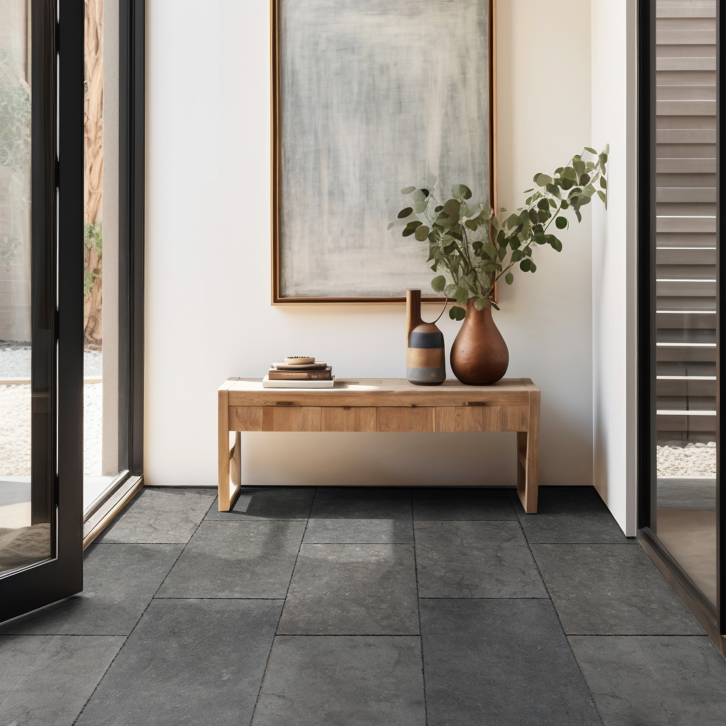 Slip-resistant honed limestone tiles with natural thermal mass—cool in summer, radiant in winter. Acid-resistant finish withstands vineyard use.